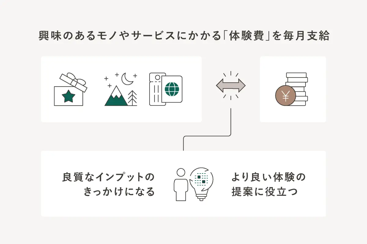 新しい体験の費用に使える「体験費」を希望者に毎月支給します。 実際の体験を日々の仕事や提案に活かしてもらいたいと考えています。 体験したことは毎月の共有会で発表することで学びが深まり、 視野や価値観が広がります。 また、毎月どんな体験をするかを考えることで、 日々の生活でインプットの機会も増えていくことも期待しています。