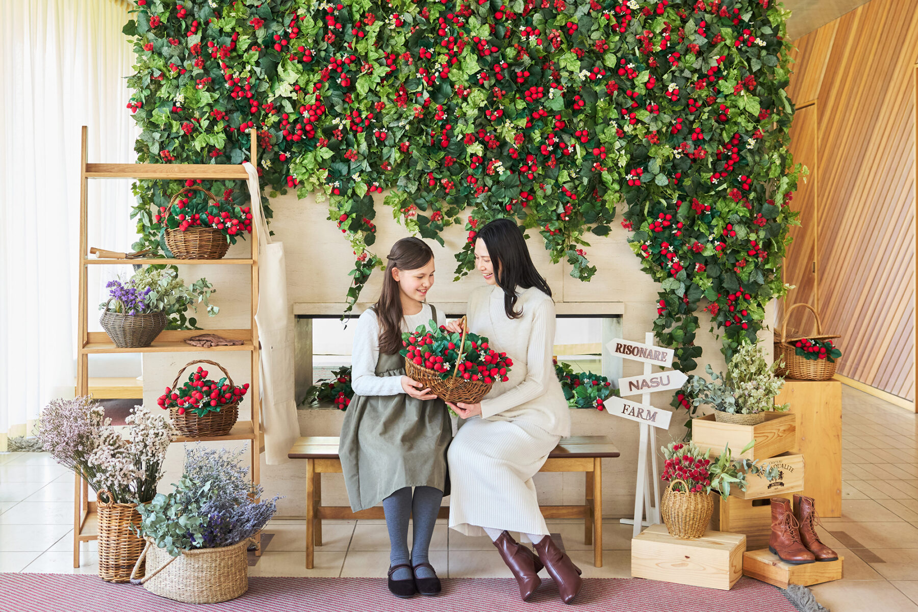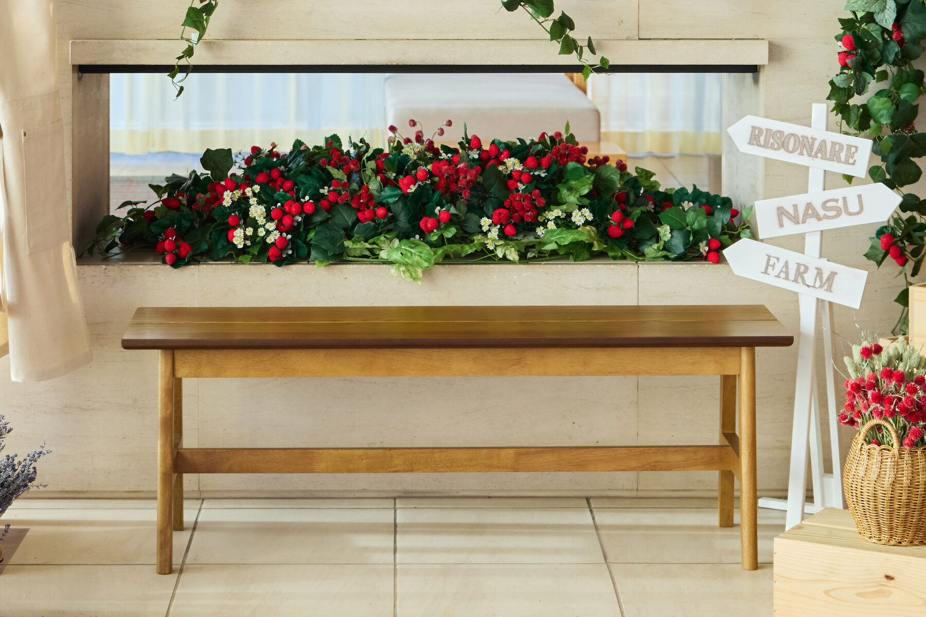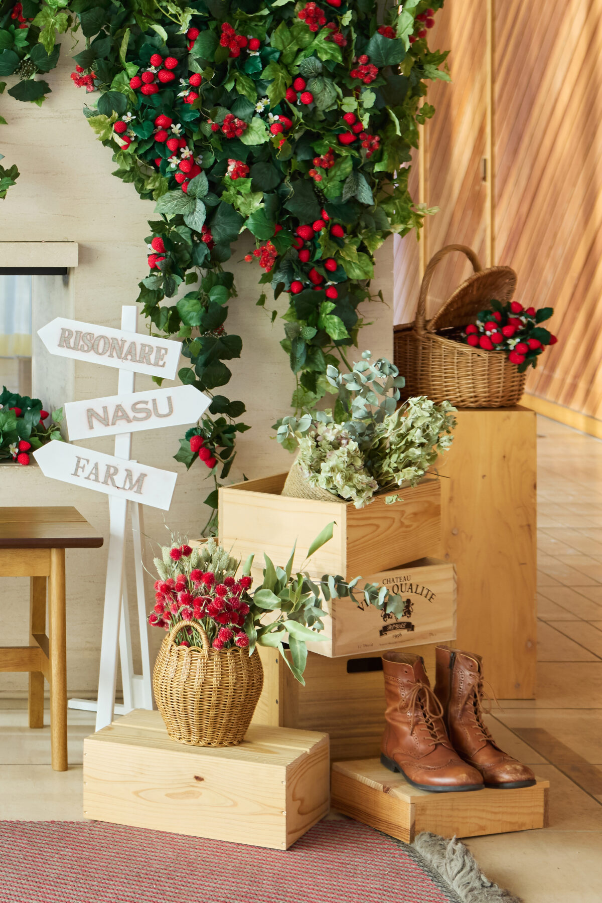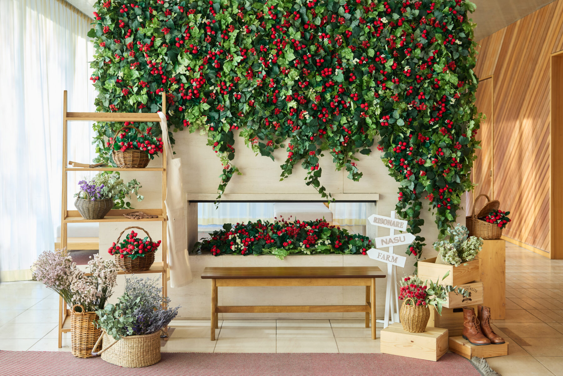 レセプションに到着するとまず目に入るのは、暖炉の壁面を彩るいちごが生い茂るような装飾です。立体的にあしらうことで、豊かな実りのボリューム感を演出しました。いちごの表現には、ドライのストロベリーフィールズを使用。みずみずしさとは異なる、少し落ち着きのある質感が、那須の雰囲気に調和し洗練された印象を与えます。さらに、ナチュラルウッドの素材感や農園を想起させるプロップスを組み合わせることで、施設内で体験できるアクティビティとも緩やかにつながる設えとしました。